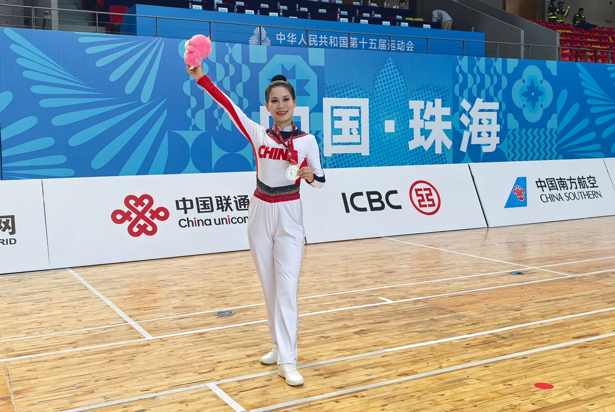 2025年9月21日,第十五届全运会群众展演项目广播体操项目比拼在中山大学珠海校区举行,经过层层选拔和预赛,湖北省代表队遴选20名运动员参加本次比赛,我校体育教师王红梅作为运动员之一随队获得二等奖。